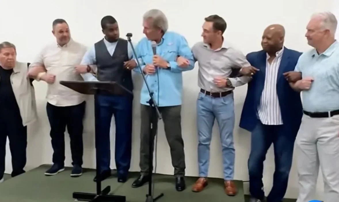 Pastors linking arms as a act of unity during the pastors luncheon for Let Us Unite 2025 at First Baptist Church.